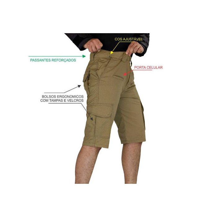 Possui 8 bolsos, sendo 2 bolsos faca, 2 bolsos laterais, 2 bolsos traseiros, 1 bolsos para pequenos objetos e 1 bolso porta treco (celular, carregador, carteiras e outros).