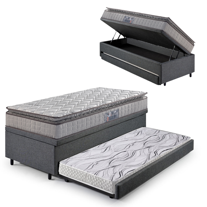 Possui abertura lateral com tampa reforçada, garantindo facilidade de acesso ao baú, que comporta até 245 litros. A cama auxiliar conta com colchão móvel de espuma Ecoline D20 Ecoflex, ideal para uso diário de até 70kg.
