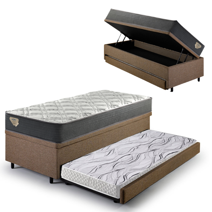 Bicama Box Baú Solteirão com Colchão Adapto Molas Ensacadas Ecoflex Linho Marrom 96x203