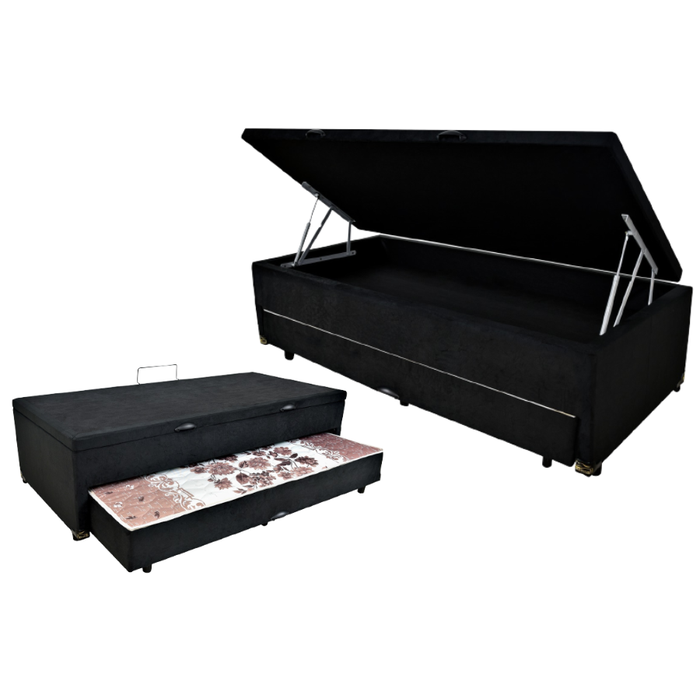 Bicama Box Baú Solteiro 88x188 com Cama Auxiliar de Molas Ensacadas 3x1 Suede Preto Preto