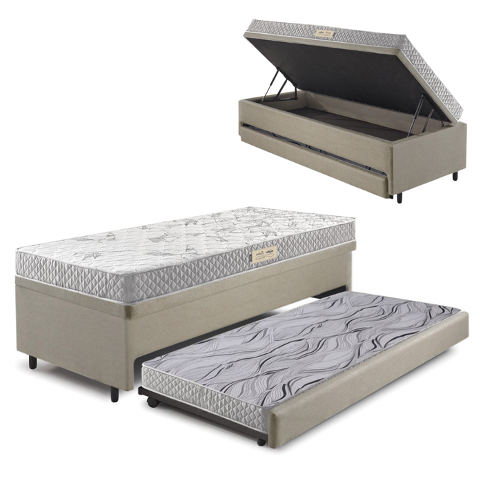 Possui abertura lateral com tampa reforçada, garantindo facilidade de acesso ao baú, que comporta até 245 litros. A cama auxiliar conta com colchão móvel de espuma Ecoline D20 Ecoflex, ideal para uso diário de até 70kg.