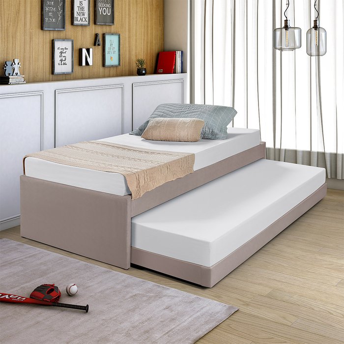 Bicama de Solteiro em Madeira Maciça Bari Revestida Tecido Pavia Bege - Php