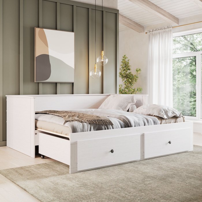 A cama Palino multifuncional e elegante é ideal para espaços pequenos, oferecendo um design inteligente que se transforma facilmente de sofá-cama de solteiro para cama de casal. Construída com pinus madeira maciça, possui um acabamento Branco Lavado que realça os veios e nós naturais da madeira, conferindo um toque de delicadeza e sofisticação ao móvel, combina resistência com um estilo contemporâneo. Dois gavetões integrados proporcionam armazenamento adicional, enquanto seu visual moderno e limpo se adapta harmoniosamente a diversos ambientes. Perfeita para quartos de hóspedes, apartamentos compactos e estúdios, a Cama Palino em Pinus redefine o conceito de conforto e praticidade em casa.