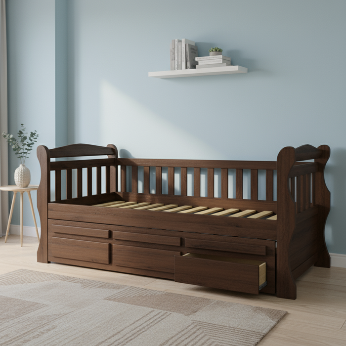 A cama de madeira é disponível em diferentes tipos de madeira, desde pinho até mogno, e pode ser personalizada para atender às suas preferências.