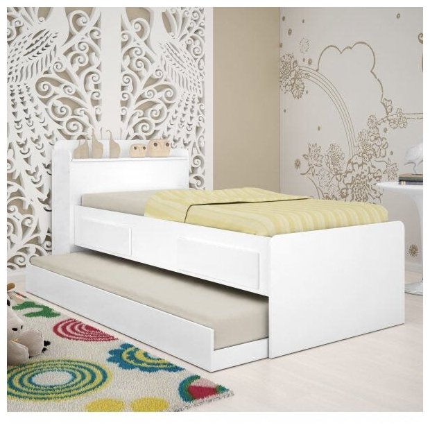 Ideal para quem procura um móvel diferenciado, com um design moderno e inovador, e que além de completar a decoração, também ofereça praticidade e seja útil. A Bicama de Solteiro Bibox Com Baú e 2 Gavetas Robel Móveis além de tudo, acompanha uma cama auxiliar de solteiro, 2 gavetas, que podem ser montadas no lado que preferir, para guardar roupas e acessórios e 1 amplo baú na cabeceira, para guardar roupas de camas e travesseiros. Ela é estruturada em MDF/MDP o que dá resistência a estrutura e a pintura ultravioleta amadeirada deixa a superfície resistente dando um aspecto de novo por muito mais tempo. Colchões indicados para ambas as camas 188cm X 88cm (Não inclusos)