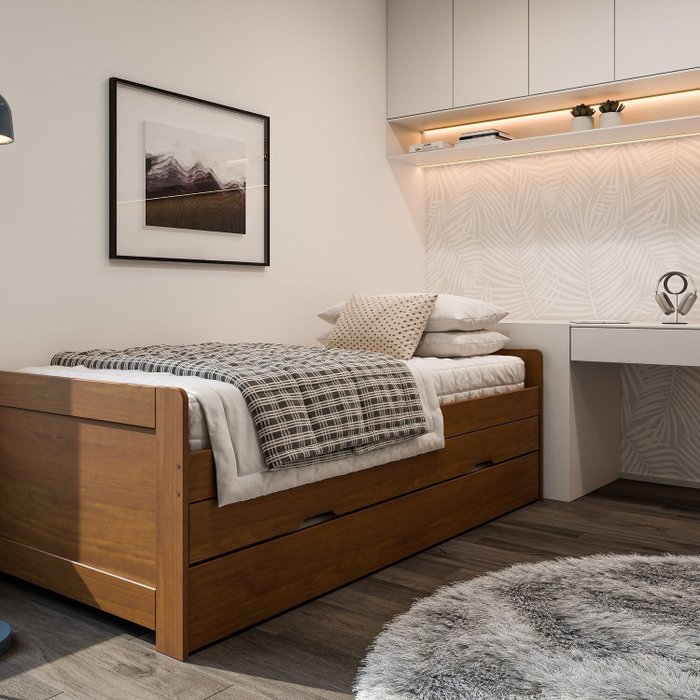 A Bicama Luma é ideal para quem busca otimizar o espaço sem abrir mão do conforto e da organização. Com um design clean e moderno, ela se harmoniza facilmente com qualquer decoração, especialmente em ambientes infantis e juvenis. Conta com uma prática Cama Auxiliar de rodízios, que desliza suavemente para oferecer um leito extra. Perfeita para receber amigos, primos ou para os pais que precisam acompanhar a criança durante a noite.O módulo inferior também integra duas gavetas espaçosas, ideais para guardar roupas de cama, brinquedos, livros ou objetos pessoais, mantendo o quarto sempre arrumado. Transforma o ambiente de dormir em um espaço de convivência e organização de forma rápida e eficiente. A solução perfeita para quartos versáteis!