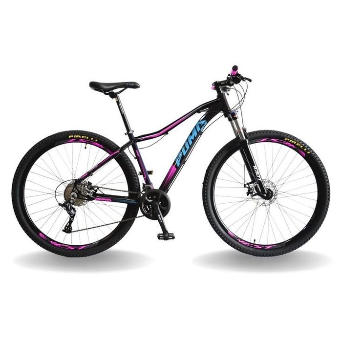 BICICLETA 29 PUMABIKE LINCE 9V STEEZ, FREIO HID, K7, SUSP TRAVA GUIDÃO, PRETO COM ROSA E AZUL, 15