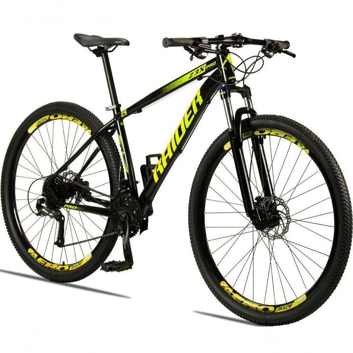 Sua busca pela bike ideal termina aqui! A Raider Z3X Pro 27v é uma ótima opção para quem quer se aventurar no mundo do ciclismo com estilo, desempenho e segurança. A bike possui um quadro altamente resistente e leve, fabricado em alumínio 6061, 27 combinações de marcha para você encarar qualquer subida, freios hidráulicos que garantem sua segurança seja a ladeira que for e uma suspensão 100mm com trava no ombro que proporciona conforto no seu percurso e mais desempenho quando travada! Aro: 29 | Marchas: 27 | Suspensão: Dianteira | Material do Quadro: Quadro Marca Raider - Modelo Z3X-PRO - Aro 29 em ALUMÍNIO 6061 | Modelo e Composição do Garfo: Garfo / Suspensão Aro 29 PRETO 100mm Trava no Ombro | Marca e Modelo do Sistema de Câmbio: Câmbio Dianteiro Shimano TZ 3v / Câmbio Traseiro Shimano Altus 9v / Trocador de Marchas Engate Rápido index - 27v imp. | Marca e Composição do Pedivela: Pedivela Reduzido em Alumínio 24/34/42 | Tipo de Freio: Freio a Disco 160mm Preto - HIDRÁULICO imp. | Modelo e Composição do Aro: Aros Aero 36 Furos Folha Dupla Alumínio | Pneus: Pneu 29 (Imp.) Cravo Baixo | Marca e Composição dos Cubos: Cubos K7 em Alumínio p/ Disco 36f Preto com Blocagens - Esferados | Modelo e Composição do Guidão: Guidão Mega Over Reto Expandido em Alumínio | Marca e Composição do Selim: Selim Sport PU | Material do Canote: Alumínio com carrinho | Importante: Bicicleta para passeios e trilhas leves, não indicada para manobras radicais e trilhas pesadas / Consulte o tamanho de quadro adequado à sua altura antes de realizar a compra. | Montagem do Equipamento: A montagem é de responsabilidade do cliente, sugerimos que seja efetuada por uma oficina especializada. | Garantia do Fabricante: 90 dias. A garantia será validada para as bicicletas montadas e revisadas por uma oficina especializada e é referente apenas ao primeiro proprietário | Informação Relevante: Pode haver alguma diferença de tonalidade entre a imagem e o produto real, por conta do tratamento de imagens e a calibração de cores do monitor Cor: Preto+Amarelo