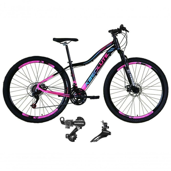 Bike aro 29, com quadro Absolute Hera, nova na caixa a pronta entrega, produto com ótima qualidade e acabamento, possui Freios a disco, Câmbio dianteiro e traseiro Shimano, 21 marchas com sistema de alavancas rapid fire que a cada clique uma marcha é trocada, garfo com suspensão. Bicicleta pré montada, vai precisar apenas fixar a roda dianteira, guidão, selim e pedais. Cor: Preto/Rosa Tamanho: 17" Quadro 29 Absolute Hera em Alumínio 6061