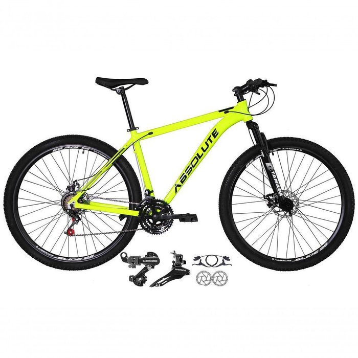 Bike aro 29 , com quadro Absolute Nero 4, nova na caixa a pronta entrega, produto com ótima qualidade e acabamento, possui câmbio dianteiro e traseiro Shimano, Freios a disco hidráulico (óleo), 21 marchas com sistema de alavancas rapid fire que a cada clique uma marcha é trocada, garfo com suspensão. Bicicleta pré montada, vai precisar apenas fixar a roda dianteira, guidão, selim e pedais. Segue abaixo características da bike: Cor: ;Amarelo