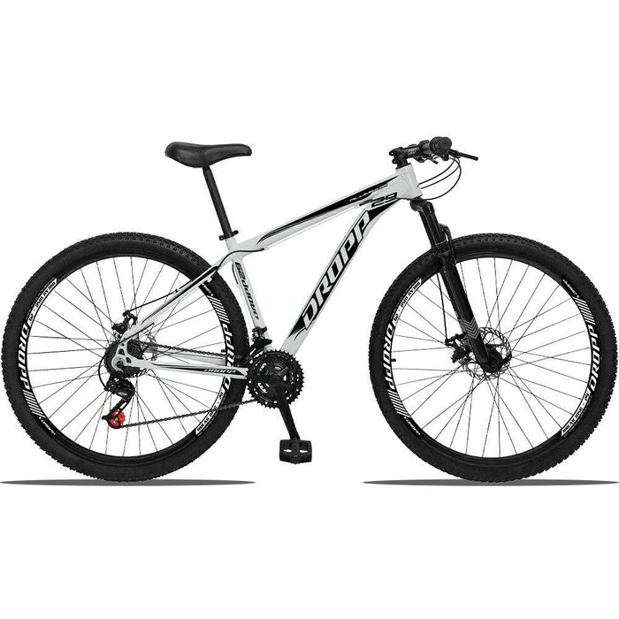 Bicicleta Aro 29 Dropp Aluminum 21v Suspensão Freio A Disco Branco Preto 17´´ Um dos modelos mais vendidos na linha Dropp a Bicicleta Aluminum possui um nome forte é uma grande gama de cores. Possui 21 combinações de marchas, trocadores Revoshift que facilita as troca para os iniciantes. Suspensão de 80mm de amortecimento e freio a disco para melhor segurança do ciclista. Quadro - Marca DROPP - Aro 29 - QUADRO em ALUMINIOGarfo / Suspensão Aro 29 em Aço 80mm Preto Trocadores Grip Shift- 21VCâmbio Dianteiro 3VCâmbio Traseiro 7VPedivela Reduzido em AçoCatraca / Roda Livre 7VCorrente 7V Freio a Disco 160mm MecânicoCubos para Disco 36f Preto com eixo BlocagensAros Aero 36 Furos Folha Dupla Alumínio PretoCâmara de Ar 29 x 1.95 Bico GrossoPneu 29x2.10 Cravo Baixo Misto Guidão Reto 31.8mm PretoSuporte de Guidão 31.8mm 80mm PretoCanote de Selim PretoBanco / Selim - Sport Preto Movimento Central Roller Preto Selado (Rolamento)Movimento de Direção Over PretoManopla Preto OBSERVAÇÕES: - Imagens Ilustrativas. Pode haver alguma diferença de tonalidade entre a imagem e o produto real, por conta do tratamento de imagens e a calibração de cores do seu monitor ou celular!- Enviamos a bicicleta pré-montada, devidamente embalada, para melhor se acomodar na embalagem de transporte são retirados apenas: selim, pedais, guidão e roda dianteira.- NÃO COBRE DEFEITOS POR MAU USO OU PELA MONTAGEM / REVISÃO INADEQUADA DO PRODUTO.- A garantia será validada para as bicicletas montadas e revisadas por uma oficina especializada e é referente apenas ao primeiro proprietário.- A garantia não se aplica para os itens de desgaste natural, tais como: Pneu, câmaras, cabos, sapatas de freio, centragem de aros, pintura do quadro, componentes da transmissão (corrente, engrenagens do pé de vela, engrenagens do cassete)