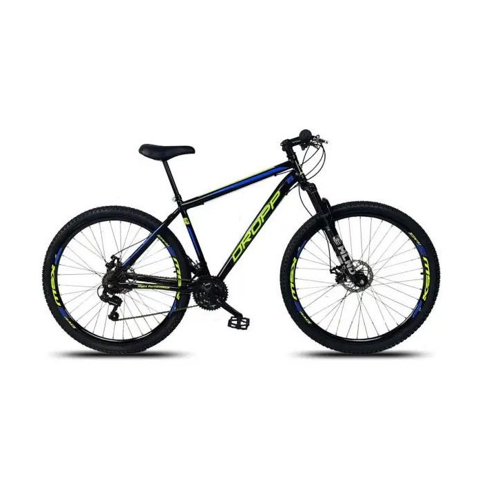 Descrição do produto: Pedalar traz benefícios não só para o corpo, mas principalmente para a sua mente! Seja ela para trilha ou asfalto, nos dias de hoje ter uma bike para os momentos de lazer é indispensável, e tudo o que você precisa é que ela possua funcionalidades de excelente desempenho para a prática. Toda a estrutura da bicicleta foi desenvolvida pensando no conforto e segurança e usuário, contando por exemplo com freios a disco que proporcionam melhor frenagem ajudando também a obter mais segurança para realizar as manobras da rota. O visual é de atrair olhares, com cores chamativas que a tornam única! Dimensões Quadro: 17. Aro: 29. Peso: 18 Kg. Características Quadro: Dropp - Modelo 29 - Aro 29. Material Quadro: Aço. Material Aro: Alumínio. Garfo/Suspensão: AHET SET Dianteira 80 mm. Cor: Preto/Amarelo/Azul. Peso Suportado: Até 130 Kg. Tipo de Aro: Aero 36 Furos folha dupla alumínio preto. Tipo de Freio: Freio a disco mecânico 160 mm preto Paco. Tipo de Guidão: Expandido preto em aço. Suporte de Guidão: Mesa preta em alumínio. Luvas/Manopla: Preto plus. Espaçador: Aheadset em alumínio 3 peças. Quantidade de Marchas: 21. Trocador de Marchas: Revo Shift Trocador Luva 21V. Câmbio Dianteiro: Paco. Câmbio Traseiro: Shimano TZ31. Banco/Selim: Sport. Canote de selim: Aço. Pedivela: Reduzido Preto em Aço Sugino. Pedais: Plataforma nylon. Corrente: 7V. Catraca: Roda Livre 7V. Cubos: Para disco 36 furos preto eixo de porcas fixo. Movimento Central: Roller 122.5 preto selado. Movimento de Direção: Aheadset preto. Pneus: 29 x 2.10 cravo baixo. Câmaras : 29 x 1.95 bico grosso. Modalidade: Mountain Bike. Volumes: 1 Volume. Recomendações de Quadros: 17 - Para ciclistas de 1,55 até 1,75 cm. 19 - Para ciclistas de 1,75 até 1,88 cm. Observações importantes - Produto para uso residencial em ambiente interno, não devendo ficar exposto diretamente ao sol, calor e umidade excessivos. - Pode haver alguma diferença de tonalidade entre a imagem e o produto real, por conta do tratamento de imagens e a calibração de cores do seu monitor. - As imagens são meramente ilustrativas, não acompanham objetos de decoração e eletrônicos. - Ao receber a mercadoria, o cliente deve verificar as condições da embalagem, caso haja alguma avaria não assine o comprovante de recebimento. - Montagem, desmontagem e outras instalações serão de responsabilidade do cliente. Não nos responsabilizamos, no ato da entrega, por subir escadas/elevadores ou pelo transporte por guincho em apartamentos. Eventuais despesas são de responsabilidade do comprador. - Confira as dimensões do produto e certifique-se de que passará normalmente por supostos elevadores, portas, escadas e/ou corredores de sua residência