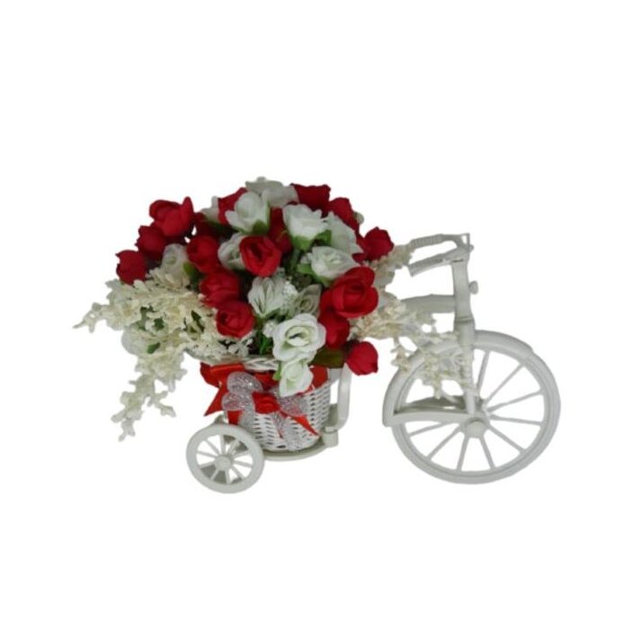 Arranjo bicicleta branca com laço vermelho e mini rosas branca e vermelha Marca: Darc flores e arranjos Bicicleta branca de plástico com laço vermelho e mini rosas branca e vermelhas de tecido com mosquitinho branco no meio. As flores são fixadas na argila e finalizadas com musgo. Enfeite decorativo pode ser usado em qualquer ambiente de casa ou escritório . Deve ser mantido em lugar que não tenha luz solar direta. Pode ser higienizado com água e detergente neutro e secado a sombra. Medidas: Altura 21 cm/Largura 21 cm/Comprimento 31 cm Peso: 542 gramas Observação: As medidas são da bicicleta já com as flores totalizando o tamanho total do arranjo.
