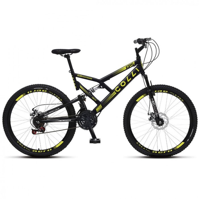 Bicicleta Colli 220 Aro Aéreo 26 Dupla Suspensão 21 Marchas Freios a Disco Preto Fosco/Amarelo Neon