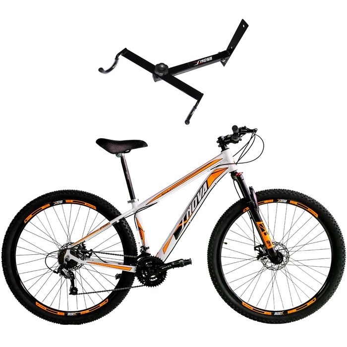 Bicicleta em Alumínio Attus Aro 29 21v Marchas Freio Disco Suspensão com Trava com Suporte de - Bran Branco/Laranja