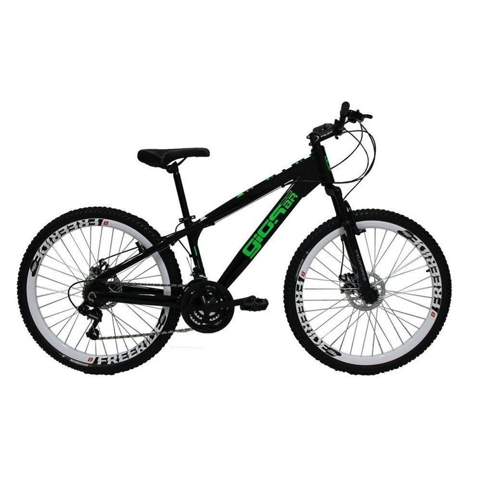 Bicicleta Gios FRX Freeride Aro 26 Freio a Disco 21 Velocidades Cambio Shimano Traseiro Dianteiro Importado Gios Preto VerdeA Bicicleta Gios FRX foi projetada para quem quer uma bike de personalidade e estilo inigualável. Ela oferece ao ciclista quadro diferenciado e design arrojado e exclusivo. Com qualidade, ela vem equipada de com 21 velocidades, permitindo ao ciclista a escolha da marcha ideal de acordo com o local. O design moderno pode ser observado no quadro da bike e os pneus são confeccionados em MTB com aro 26, garantindo segurança total a cada manobra em qualquer tipo de terreno.Bicicleta vem regulada, ficando por conta do comprador apenas ajuste de canote/selim/guidão e inserção da roda dianteira.Informações técnicas: