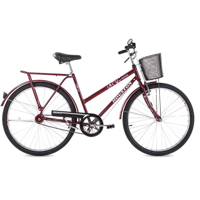 A Bicicleta Houston Ônix FV é uma excelente opção para o cliclista interessado em uma pedalada leve na cidade. Esse modelo traz todos os acessórios de bicicletas maiores, aro 26 em alumínio, freios varão e quadro em aço carbono rígido.Quadro: Utilitário feminino em aço carbono;Garfo: Aço carbono com suspensão standard, curso 55mm; Caixa de direção: Standard;Corrente: Grossa preta;Movimento central: 45mm; Pedivela: Monobloco 165mm cromado; Cassete: Roda livre 20 dentes; Pedais: Plástico com refletor, 1/2; Guidão: Aço carbono cromado 580mm;Freio: Varão; Abraçadeira: Aço carbono; Selim: Largo com 2 molas;Canote do selim: Aço carbono cromado 22.2x280mm; Rodas: 26, alumínio cromado;Pneus: Convencional preto 26x1.1/2x2.