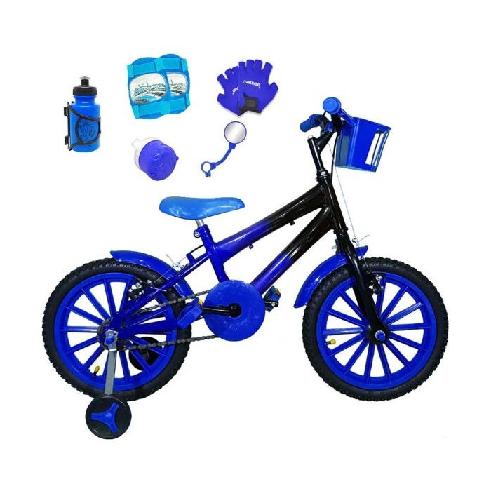 Bicicleta Infantil Aro 16 Azul Preta Kit Azul com Acessórios e Kit Proteção