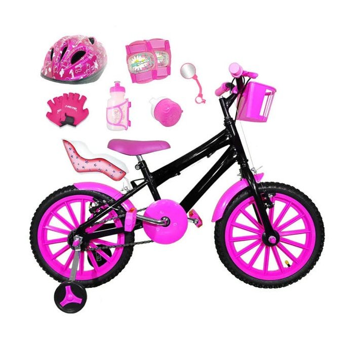 Bicicleta Infantil Aro 16 Preta Kit Pink com Capacete, Kit Proteção e Cadeirinha