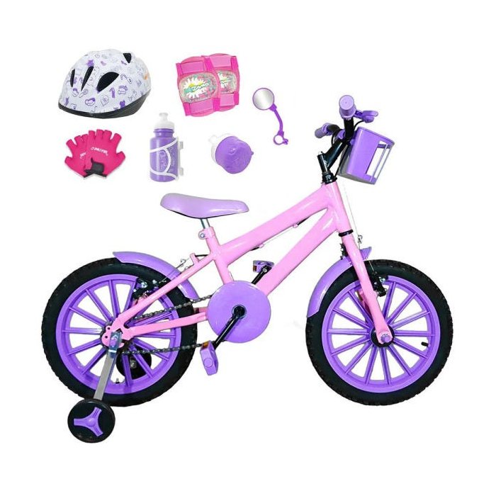 Bicicleta Infantil Aro 16 Rosa Bebê Kit Roxo com Capacete e Kit Proteção