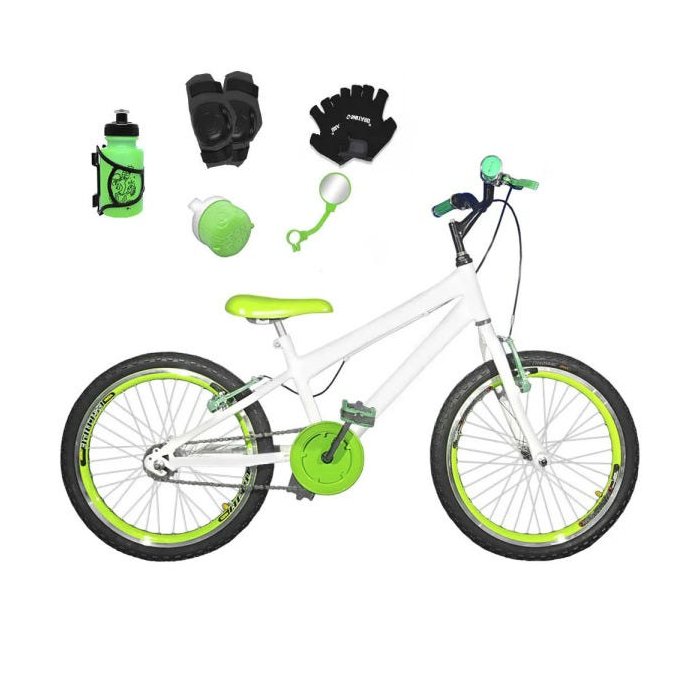 Bicicleta Infantil Aro 20 Branco Kit e Roda Aero Verde com Acessórios e Kit Proteção