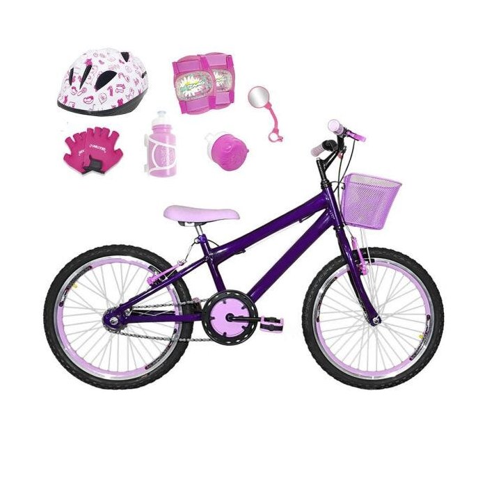 Bicicleta Infantil Aro 20 Roxa Kit e Roda Aero Rosa Bebê com Capacete e Kit Proteção