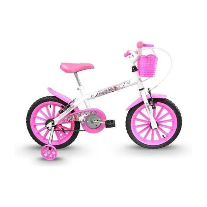 A bicicleta infantil Pinky aro 16 é composta por rodas de plástico reforçado, já vem com rodinhas laterais para auxiliar no equilíbrio da criança, para-lamas dianteiro e traseiro, freio V-Break com manetes de plástico garantindo uma frenagem mais precisa.