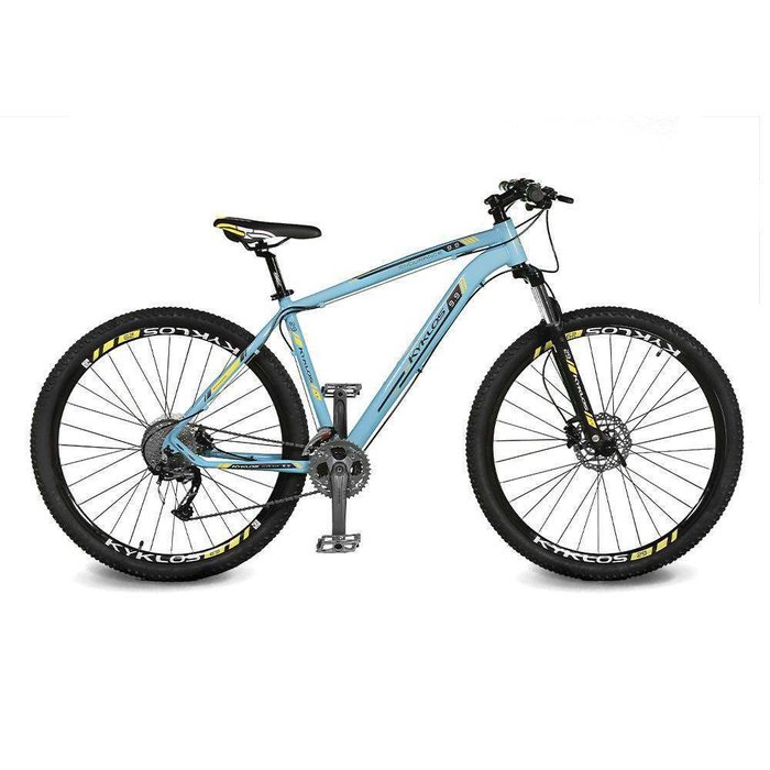 Kyklos em grego significa círculo, roda. Seis letras com uma ideia precisa, criar bicicletas de alta performance, com estilo único e perfeita ergonomia. Tudo isso para proporcionar a você o máximo de conforto a cada pedalada. Cada componente da bicicleta é escolhido após rigoroso processo de análise, seguindo padrões internacionais.Descrição do Produto: Quadro 29 em alumínio, Suspensão dianteira 100 mm com Trava, Kit Transmissão Shimano 27 velocidades, Câmbio Dianteiro e Traseiro Alivio M-4000, Cassete 9v. 11/36D, Corrente Shimano CN-HG53, Alavanca de Câmbio Alivio M-4000, Pedivela Shimano Alivio M-4000 40-30-22, Movimento Central BBES 300, Freio a Disco Hidráulico, Guidão em Alumínio 700 mm, Suporte de Guidão em Alumínio Head Set 31,8 mm, Rodas com Aros Aero e 32 Raios, Cubo Shimano Center Lock com Blocagem, Pneus 2.10, Canote de Selim em aluminio, Selim Anatômico, Abraçadeira de Selim com Blocagem, Pedal Plataforma em alumínio.Como escolher o tamanho do quadro: 17