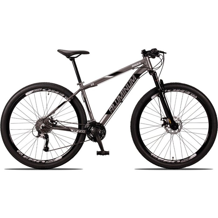 BICICLETA 29 RAIDER ALUMINUM 27 MARCHAS CAMBIOS IMPORTADOS - SUSPENSÃO E FREIOA DISCO MECÂNICOA Nova Raider Aluminum possui um quadro construído em alumínio 6061, liga própria para que fique mais leve e mais resistente. É uma mountain bike esportiva, desenvolvida para fazer trilhas no mundo do MTB.Sua geometria esportiva oferece um comportamento excepcional, deixando-a rápida e ágil para as melhores sensações no seu pedal.A Raider Aluminum vem equipada com a suspensão de 100mm que facilita a passagem nas trilhas, transmissão de 27 marchas indexados, o que proporciona melhor troca entre o cassete e cambio. Os aros são de alumínio de parede dupla da marca FLAY modelos Aero Race, os pneus 29" proporcionando uma melhor rolagem aderência nas curvas. Os freios utilizam sistema a disco mecânico de ótima frenagem.DETALHES TÉNICOS:QUADRO: 29" Alumínio 6061SUSPENSÃO:100 mm (sistema a molas)CAIXA DE DIREÇÃO: Semi-IntegradaGUIDÃO: Reto 31.8mm em Alumínio 6061MESA: 80x31.8 mm em Alumínio 6061MANOPLAS: Borracha FlexívelTROCADORES: Importados 3x9 velocidadesFREIOS: Disco Mecânico de 160 mmCÂMBIODIANTEIRO:Importado Indexado de 3 VCÂMBIO TRASEIRO: Importado Indexado de 9 VPEDIVELA: Triplo em Aço 24/34/42 dentesPEDAL: Plataforma em NylonCORRENTE 9 VelocidadesCASSETE : 9 VelocidadesCANOTE DE SELIM: 27.2mm em Alumínio 6061SELIM: PU com trilho de regulagemRODAS: Rodas Flay Aero Race de Parede Dupla/CassetePNEU: MTB 29"OBSERVAÇÕES:- As fotos do anúncio são feitas com quadros do tamanho 17''.- A geometria do quadro (desenho) pode mudar conforme o tamanho escolhido alterando a inclinação do tubo superior quando quadro é 19 ou 21 deixando-o mais reto.- Pode haver alguma diferença de tonalidade entre a imagem e o produto real, por conta do tratamento de imagens e a calibração de cores do seu monitor.MONTAGEM- Enviamos a bicicleta pré-montada, revisada e devidamente embalada, para melhor se acomodar na embalagem de transporte são retirados apenas: selim, pedais, guidão e roda dianteira.- A instalação (por simples aperto de parafusos allen e blocagens) é de responsabilidade do cliente, recomendamos que seja feita por uma loja especializada.- Por motivo de transporte e manuseio, pode haver a necessidade de efetuar uma nova regulagem de câmbio ao receber o produto.- Não nos responsabilizamos pela revisão final da bicicleta, sugerimos que seja efetuada por mão de obra especializada.GARANTIA - 1 ano para quadro e 3 Meses para peças.