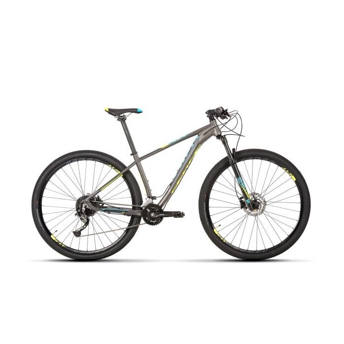 A Intensa vem equipada com suspensão Rock Shox 30 TK, de 100mm e trava no guidão, além da transmissão Shimano Alívio 2×9 v.