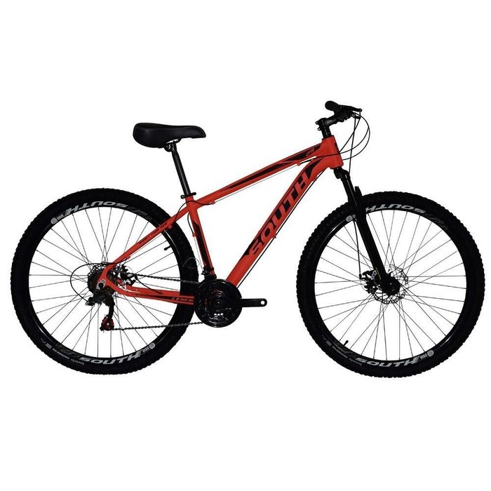 Bicicleta alumínio aro 29'' CAMBIO 21 Velocidades quadro 19, freio a disco mecânico, garfo de aço, suspensão 60 mm, cambio dianteiro 3v, cambio traseiro 7v, guidão MTB alumínio, pneus de borracha MTB, pedivela triplo aço, pedal MTB Nylon, selim tipo MTB espuma, movimento central selado, cubos de aço para freio a disco. Medidas da bicicleta: L 68 cm x A 78 cm x C 170 cm. Peso do produto: 15 Kg. Cor: Vermelha. Southbike é especializada na produção de bicicletas, desde 1998, nos estilos Mountain Bike, Freeride, Infantil e Urbana. Com fabricação própria de toda linha de quadros, garfos, guidões, bagageiros em aço carbono e na distribuição de peças e acessórios. OBS.: O produto vem desmontado