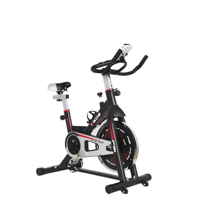 Bicicleta Spinning Kikos F5i A bicicleta de spinning Kikos F5i possui sistema de resistência mecânico por atrito, carga ajustável manualmente permitindo que você aumente a intensidade da carga na pedalada e display auto scan com informações de tempo, velocidade, calorias e distância. Indicada para uso residencial, o equipamento é diferenciado pelo seu design arrojado e inovador.