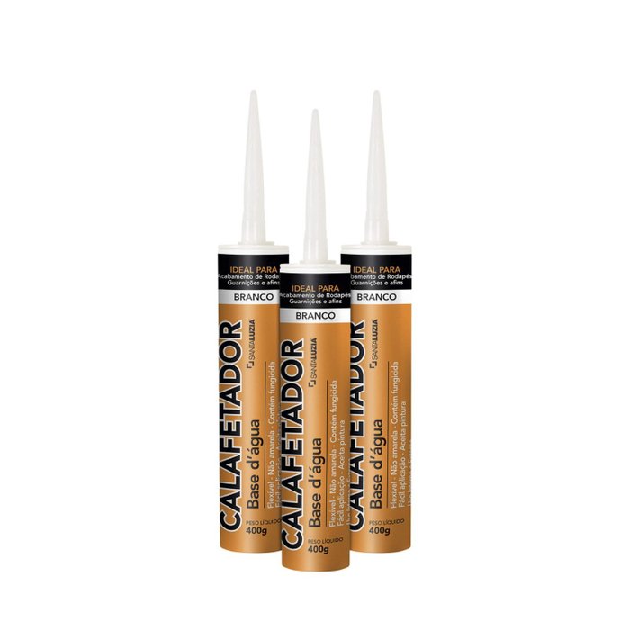 O Calafetador Base D'água Santa Luzia é um produto especial para rodapés, guarnições e outros acabamentos. Também é indicado para vedação de esquadrias, janelas, móveis, entre outros. Possui aderência em madeira, MDF, gesso, drywall e alvenaria.