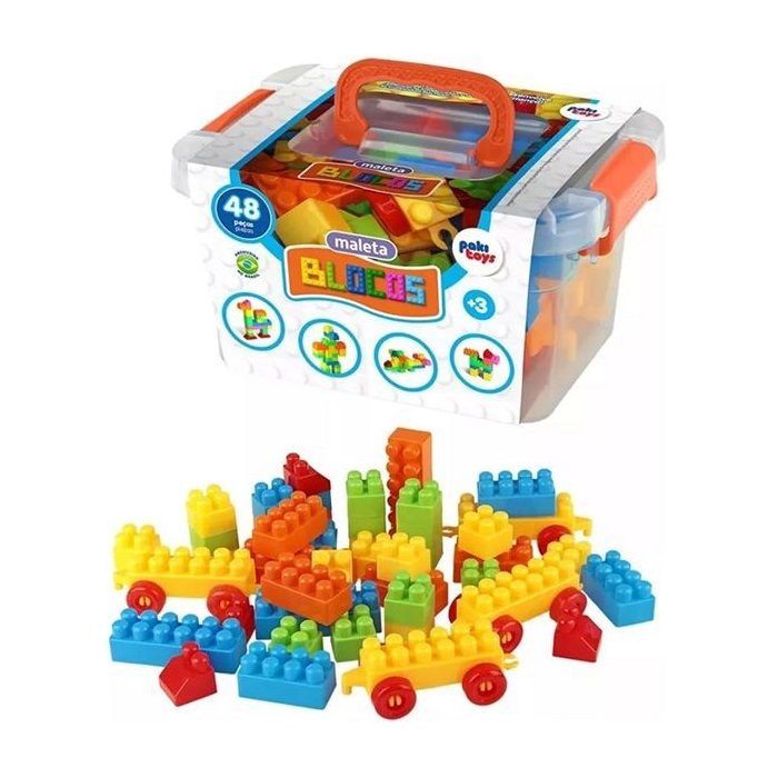 Diversão e Aprendizado: Conjunto de blocos de montar com 48 peças coloridas e uma maleta prática para guardar e transportar.