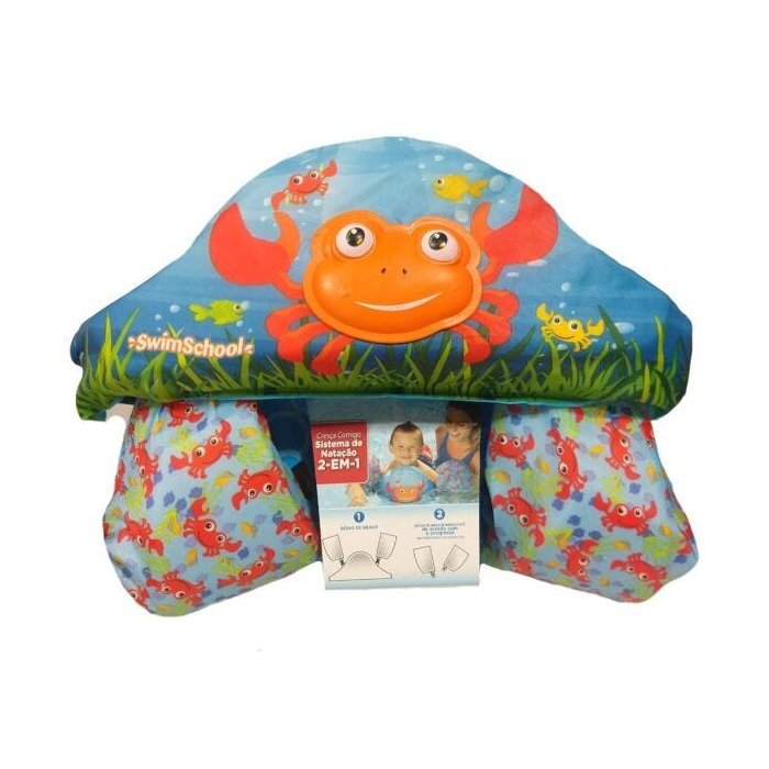 Há mais de 25 anos, SwimSchool vem sendo a marca confiável para treinamentos de natação. O Colete Flutuante Infantil é o mais seguro para os pequenos brincarem na água com segurança. Sistema de Natação 2 em 1, colete com boia de braços removível. Oferece estabilidade e confiança a criança, além de não atrapalhar na sua movimentação. Habilidades de Natação nível 3. Indicado para crianças acima de 3 anos. Selo do Inmetro Os fechos são de engate rápido e com sistema de trava. Modelos disponíveis: Caranguejo Dimensões (AxLxP) Boia de corpo: 40 x 15 x 6,5 cm Boia de braço(individual): 12 x 20 cm Material Feito de espuma de flotação (PU) e revestido de nylon. Recomendação de Uso Recomendado para crianças de até 23 kg