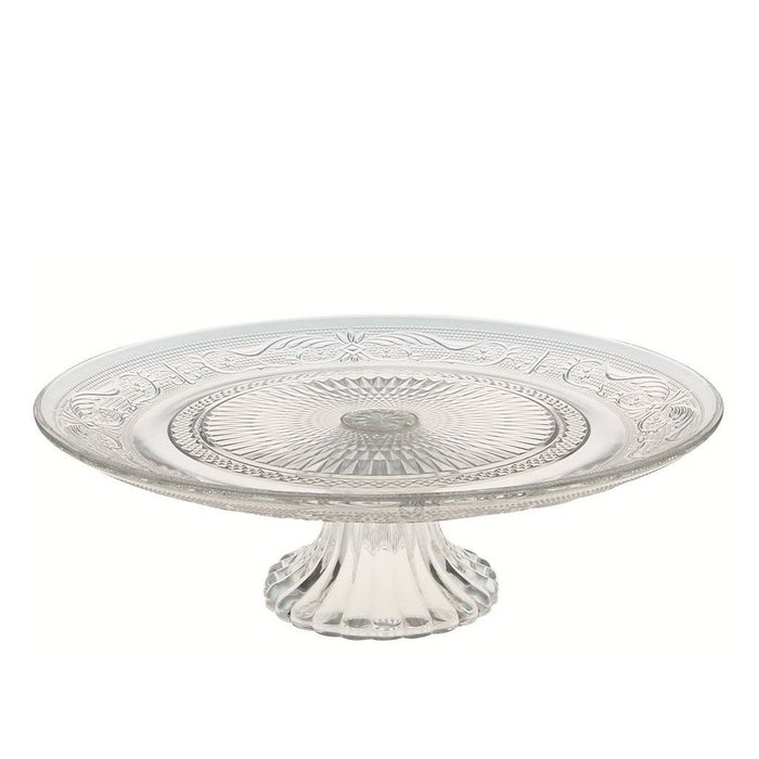 Seu design trabalhado com relevo em estilo vintage e acabamento em vidro transparente cria um efeito visual encantador, valorizando ainda mais os alimentos expostos. A base elevada e firmemente estruturada proporciona estabilidade e destaque à apresentação.