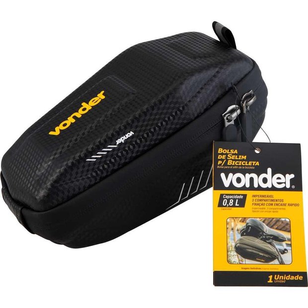 Cod. do Fornecedor: 3540030000 Marca: Vonder Conteúdo da embalagem: 1 Bolsa de selim para bicicleta Vonder Bolsa resistente à água (impermeável). Possui um total de 3 compartimentos e sistema de fixação com encaixe rápido. Indicada para carregar objetos de pequeno porte na bicicleta. Garantia legal: 90 dias Material: PU + EVA Dimensões: Externa: 200mm x 110mm x 95mm; Interna: 180mm x 90mm x 75mm Massa aproximada (peso): 0,169 kg