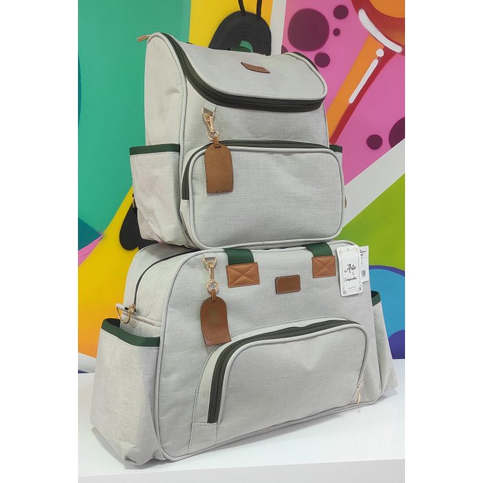 O kit bolsa Ellen Arte e Companhia possui 1 Bolsa tamanho G com bolsos laterais e um bolso frontal com fechamento em zíper, e 1 mochila. Um kit de bolsas para acompanhar a mamãe desde a maternidade, até viagens e passeios. Design moderno e material resistente, não descasca nem resseca. Alças anatômicas, com costuras reforçadas, detalhes em courano.