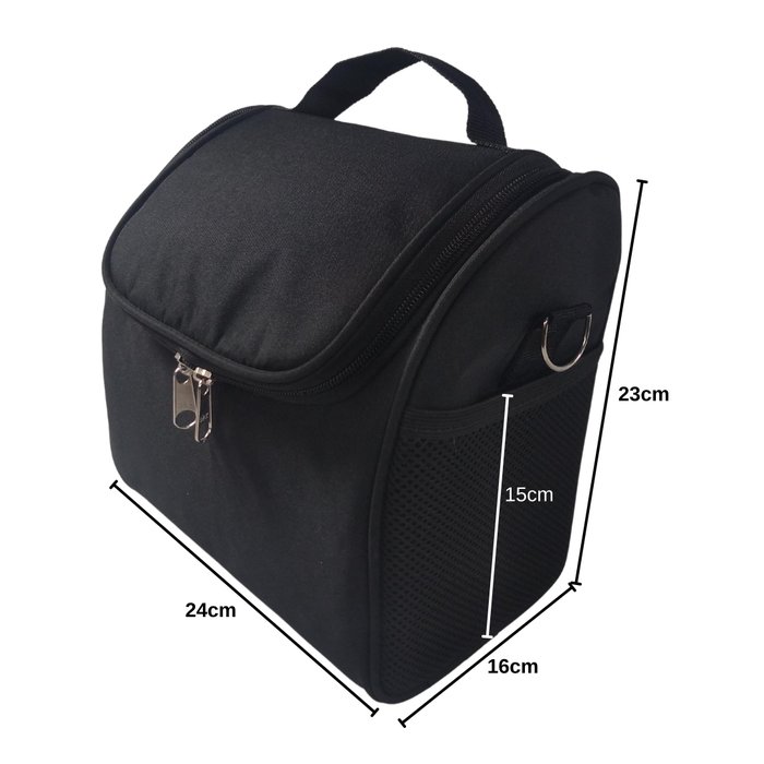Serve como um cooler, lancheira, marmiteira, feita em material de nylon 600 na parte externa e tnt laminado na parte interna, o material é fácil para limpar, esse produto tem alta qualidade na costura, possui fecho duplo e um ótimo deslize do zíper, a bolsa possui puxador de mão reforçado e uma alça para o ombro ajustável, nas laterais possui 2 bolsos abertos e possui um suporte para carrinho de mala, todos acessórios da bolsa são feitos de metal.