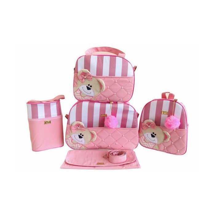 Bolsa Maternidade 5 Peças Completo Courino Ursa Orelhinha Rosa Bebê