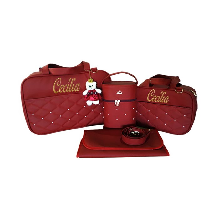 Confeccionadas em Corino (Couro Ecológico de ótima qualidade) não descascaForro interno impermeável:A parte interna é toda forrada com material plastificado térmico lavável de boa qualidade.as bolsas são todas durinhas e feita sob medida para as mamãe,O KIT COMPÕE 4 PEÇAS* Medidas da Bolsa Grande: 42 cm de Largura x 16 cm de Profundidade x 32 cm de Altura* Medidas da Bolsa Média: 32 cm de Largura x 15 cm de Profundidade x 22 cm de Altura* Porta Mamadeira duplo* Trocador 52cm x 32cm* pingente de Urso.* Alça de mão dupla e alça de Ombro (Removível)Fácil de LimparProduto com Ótima QualidadeFeitas com dedicação e cuidado para o seu bebêfabricado no Brasil.