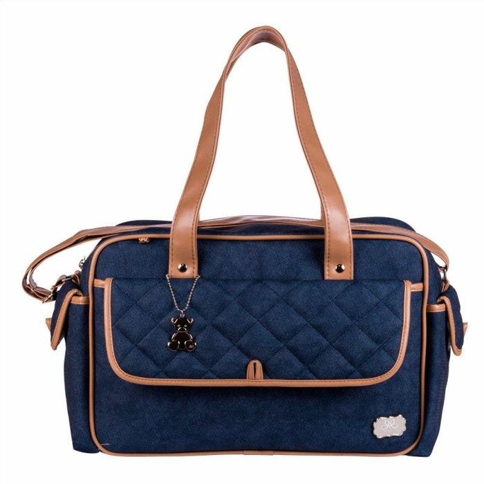 A bolsa Jeans média da Momole vem em material sintético e impermeável. Possui amplo espaço com um bolso interno, prendedor de mamadeiras, um trocador simples, um chaveiro de urso, bolso frontal com fechamento em velcro, dois bolsos laterais, alça de mão e transversal.