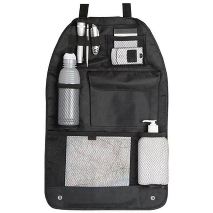 - Suporte para Lata de Refrigerante e Cerveja, Água, Bebidas, Garrafas Pet e muito mais.- Bolso de malha inferior e frisado com duas divisões com suporte para Trecos, Acessórios, Objetos Multiuso, Revistas, Livros, Mapas e do outro lado um suporte para Garrafas de Plástico, Garrafa Pet,  Garrafa de Vidro, Long Neck e Muito mais.- Ajuste Perfeito para fixar seu suporte com muito mais Conforto e Segurança.- Material: Nylon 420D