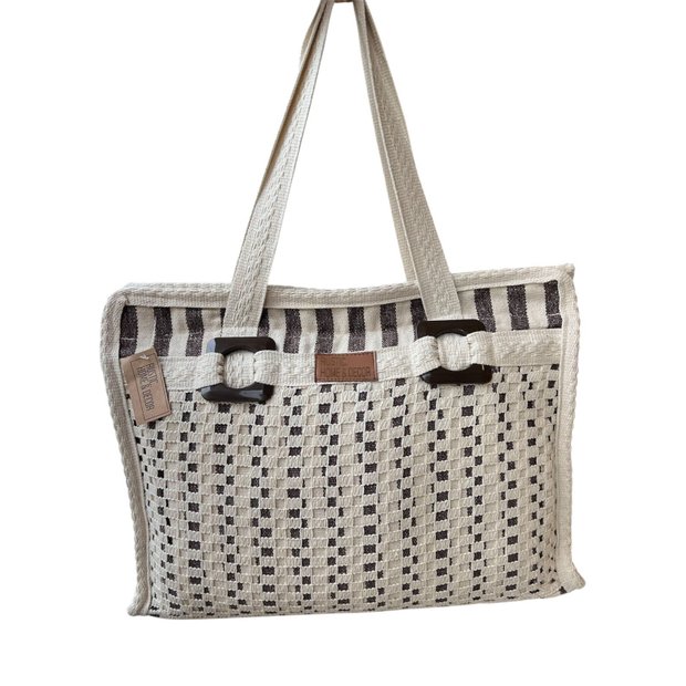 Bolsa Retangular em Algodão com Macramê / Cru com Listra Marrom Cru com Listra Marrom