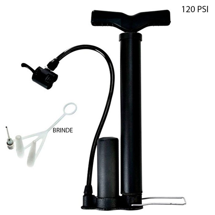 Suporta até 120 psi/bar material em alumínio resistente mangueira em material emborrachado maleável e resistente embolo leve ergonomico e ajustavel as mãos possui acessórios (ponta para encher bola e ponta para encher piscina infantil, colchão inflável etc) altura até 55 cm.
