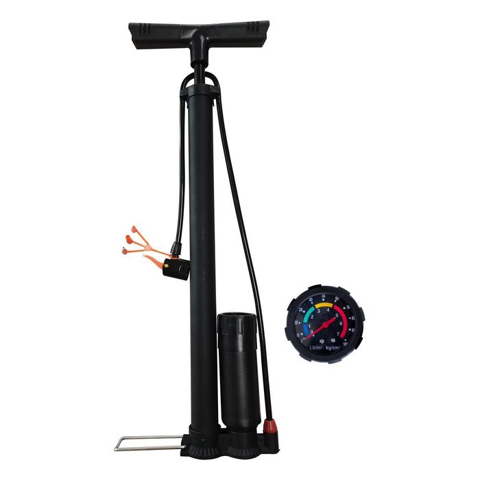Suporta até 100 psi/bar material em alumínio resistente mangueira em material emborrachado maleável e resistente embolo leve ergonomico e ajustavel as mãos possui acessórios (ponta para encher bola e ponta para encher piscina infantil, colchão inflável etc) altura 65 cm