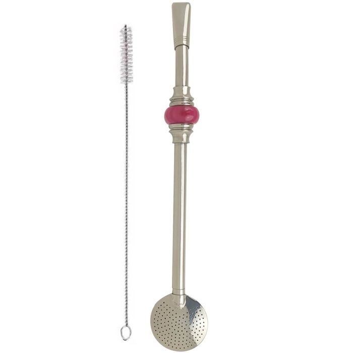 Bomba De Chimarrão Inox Anel Pedra Ágata Com Rosca Biqueira Rosa Mesclado