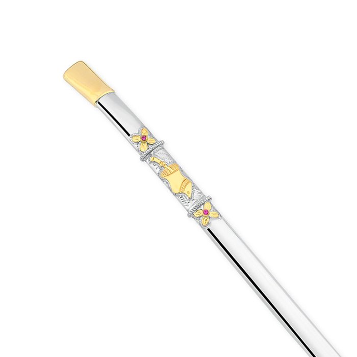 O grande destaque da bomba Bento Gonçalves certamente é o acabamento trabalhado no cano. Uma pequena cuia e duas flores delicadamente adicionadas na bomba garantem estilo e delicadeza. O nosso toque de requinte fica por conta da aplicação de duas pedras em rubi sintético localizadas no centro das flores aplicadas no cano.