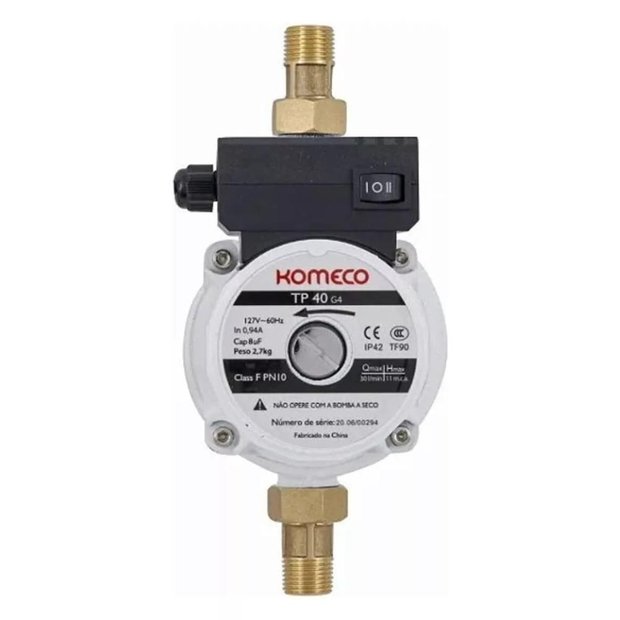 Mantenha sua rede hidráulica pressurizada com eficiência e confiabilidade. Características Principais: Pressurização para Aquecedores a Gás: Ideal para garantir pressão constante em sistemas de aquecimento. Temperatura de Operação: Suporta água quente até 90°C com resistência à temperatura de até 140°C. Funcionamento Automático ou Manual: Equipado com fluxostato para acionamento automático, proporcionando mais conforto e praticidade no uso. Rotor em Plástico de Engenharia (ABS): Durável e eficiente, garantindo longa vida útil. Silenciosa: Baixo nível de ruído para maior tranquilidade no ambiente. Protetor Térmico Integrado: Sistema de segurança que evita superaquecimento e danos ao motor. Filtro de Partículas: Garante maior qualidade da água e protege o sistema contra sedimentos e impurezas. Resistência à Oxidação: Desenvolvida para maior durabilidade em diferentes ambientes, incluindo regiões litorâneas. Especificações Técnicas: Modelo: Mini Bomba TP 40 G4 - Ferro Descrição do Sistema: Minibomba de Água TP 40 G4 Tensão: 127 V Corrente de Operação: 0,94 A (127 V) Potência: 120 W Acionamento Automático: Fluxostato Pressão Máxima: 11 m.c.a. Vazão Máxima: 30 litros/min Vazão Mínima de Trabalho: 2 litros/min Temperatura Máxima de Trabalho da Água: 90°C Temperatura Máxima de Resistência da Água: 140°C Temperatura Máxima Ambiente: 40°C Conexões de Entrada/Saída: ¾" Dimensões do Produto (L x A x P): 16,0 cm x 13,85 cm x 10,4 cm Dimensões da Embalagem Individual (L x A x P): 17,5 cm x 15,5 cm x 11,8 cm Peso Bruto: 3,0 kg Rotação: 3500 RPM Diâmetro do Rotor: 9,5 cm Diferenciais: Fácil instalação. Ideal para recirculação em sistemas solares. Excelente relação custo-benefício.