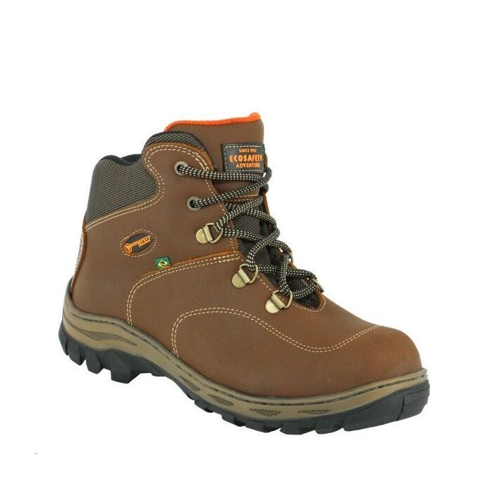 BOTA DE SEGURANÇA ADVENTURE EM COURO FERRUGEM ECOSAFETY com acabamento em látego, com cadarço preto com bege, solado de borracha costurado nas laterais onde há um reforço dando mais durabilidade no calçado, colarinho acolchoado de espuma com espessura 14mm, língua com sistema fechado, com biqueira de PVC, com forração externa em nylon.